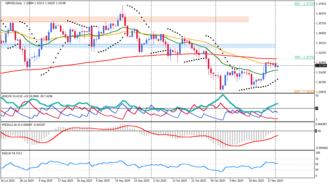 The overall technical bias for GBP/USD is currently neutral to ranging, with a medium confidence level. The daily chart indicates that price closed significantly lower in the previous session, forming a large bearish candle. While the price remains above the 20-day EMA at 1.31827, a bearish alignment where the 20-day EMA is positioned below the 50-day EMA (1.32354) and the 200-day EMA (1.32753) suggests underlying bearish pressure. This aligns with the fundamental headwinds facing the Pound Sterling from BoE dovishness and political uncertainty. The MACD is marginally positive, and RSI is neutral at 52.99. The ADX at 33.61 indicates a strong trend, but recent price action points to a potential shift in momentum, particularly as GBP fundamentals deteriorate.On the H4 timeframe, the pair exhibits clear range-bound behavior. Price trades between the 20-period EMA at 1.32184 and the 50-period EMA at 1.31902, with the 200-period EMA at 1.32107 in close proximity. This tight clustering of EMAs confirms a lack of clear directional bias, reflecting the current market uncertainty stemming from both UK domestic issues and the nuanced US Fed policy outlook. MACD is positive, but RSI is neutral at 49.74, and ADX is low at 16.47, indicating weak trend strength.