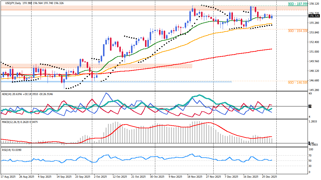 The USD/JPY pair displays a nuanced market structure across timeframes. On the daily (D1) chart, the price closed below the 20-period EMA (156.131) but remains comfortably above the 50-period (155.183) and 200-period (151.402) EMAs, indicating a resilient underlying long-term bullish trend despite recent consolidation. The MACD is positive at 0.269, supporting this bullish outlook, while the RSI is neutral at 53.68. The ADX at 20.64 suggests a developing, rather than strong, trend, implying that the long-term bullishness, while present, lacks aggressive conviction. The SAR at 154.955 confirms the bullish trend remains intact below current price. This underlying long-term bullishness is fundamentally supported by the persistent policy divergence between the BoJ and other major central banks, even with the BoJ's recent rate hike, as the carry trade continues to favor the USD.In the medium-term (H4) framework, the pair trades above the 20-period EMA (156.240), 50-period EMA (156.196), and 200-period EMA (155.492), reinforcing a bullish bias. However, the MACD near zero (-0.003) signals flat momentum, while the RSI is neutral at 53.48 and the Stochastic is in the overbought zone at 70.86. The ADX at 18.42 suggests a ranging market, which conflicts with the bullish EMA alignment and indicates a pause in medium-term directional strength. The SAR at 156.564 acts as immediate resistance above the current price. This medium-term consolidation reflects market participants grappling with the BoJ's recent policy shift and the Fed's cautious dovishness, creating uncertainty about the sustainability of the current rally.