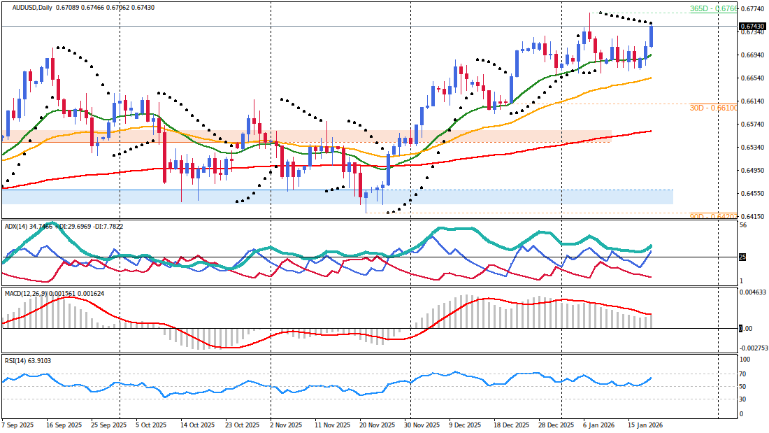 Momentum indicators such as the RSI remain in bullish territory without reaching extreme overbought levels on the daily chart, suggesting that the move has further room to extend toward 0.6800. However, the hourly RSI has reached overbought regions, necessitating a period of consolidation to neutralize short-term exhaustion before the next leg higher.