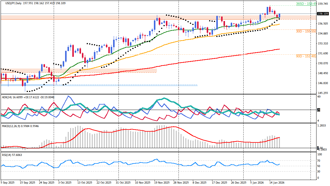 The USD/JPY pair currently navigates a complex intersection of technical consolidation and heightening fundamental volatility. While the technical structure maintains a primary bullish bias, price action remains tethered to the 158.16 resistance level as market participants weigh competing drivers. The US Dollar finds support from reduced Federal Reserve rate cut expectations, yet the Japanese Yen is experiencing dual-sided pressure. On one hand, speculation regarding a snap general election in Japan under Prime Minister Sanae Takaichi introduces fiscal uncertainty that weighs on the Yen. Conversely, renewed global risk aversion, triggered by US tariff threats against European nations, reinforces the Yen's traditional safe-haven appeal. Technical structure combined with the looming Bank of Japan (BoJ) policy decision on January 23rd supports a cautious but constructive outlook for the pair. Critical support at 157.50 remains the pivot for the bullish thesis, while a decisive breakout above 158.16 is required to confirm trend resumption ahead of high-impact US macroeconomic data releases.