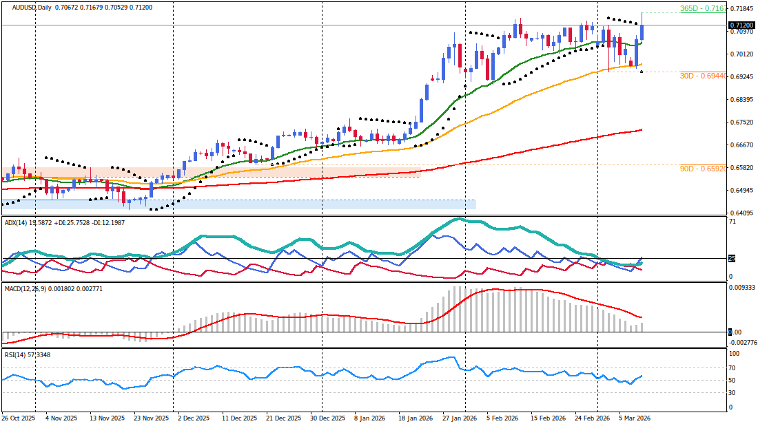 The AUD/USD currency pair maintains a dominant bullish structural profile across higher timeframes, recently reaching a three-year peak of 0.7168. This technical breakout aligns with a shifting fundamental backdrop characterized by increasing speculation regarding a Reserve Bank of Australia (RBA) interest rate hike at the upcoming March meeting. While the primary trend remains positive, price action is currently undergoing a corrective phase as market participants digest the impact of rising oil prices and geopolitical tensions in the Middle East. Technical structure combined with hawkish rhetoric from RBA Deputy Governor Andrew Hauser supports the case for trend persistence, though immediate headwinds from a strengthening US Dollar ahead of critical inflation data necessitate a cautious approach to entry levels. The current market view favors buying structural dips as long as the pair remains above the 0.7100 psychological threshold.