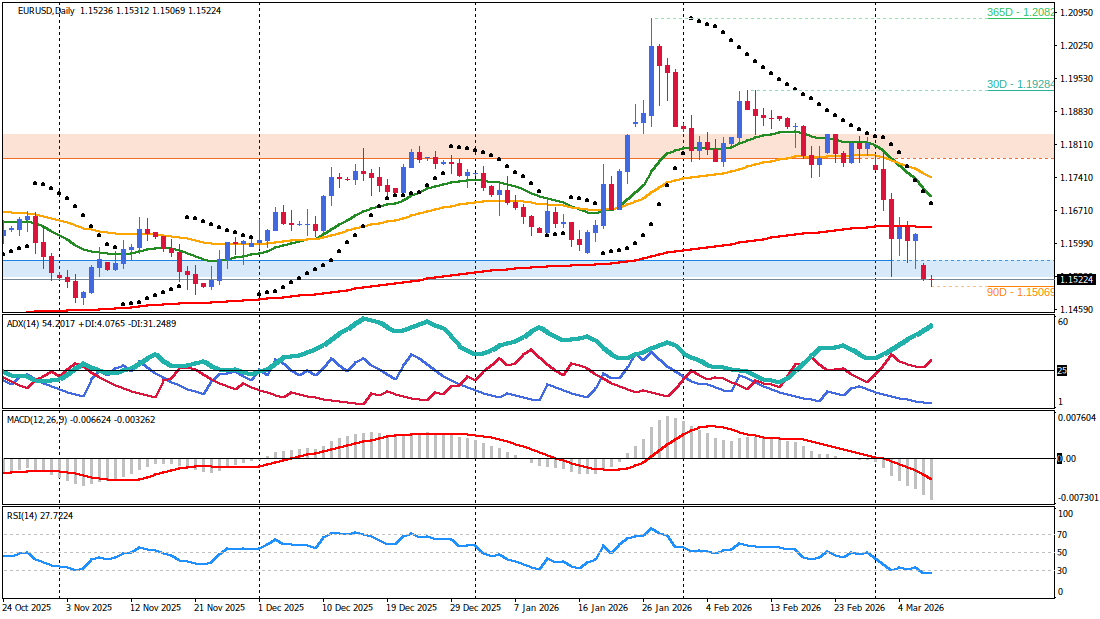 The EUR/USD pair remains locked in a decisive bearish trend as of March 9, 2026, driven by a potent combination of technical breakdown and a deteriorating fundamental backdrop. While the pair is attempting a modest intraday corrective bounce toward 1.1550 during the London session, the broader market structure is firmly controlled by sellers. This technical weakness is fundamentally reinforced by escalating hostilities in the Middle East, specifically the Iran conflict, which has propelled crude oil prices above $115 per barrel. These geopolitical tensions have triggered a broad "risk-off" sentiment, favoring the US Dollar as a premier safe-haven asset while simultaneously pressuring the Euro due to the Eurozone's sensitivity to energy price shocks. Technical structure combined with the current risk-averse environment supports a "sell the rallies" approach, with market participants closely monitoring the upcoming US Consumer Price Index (CPI) data as the next major catalyst for directional conviction.