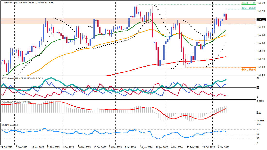 The USD/JPY exchange rate maintains a dominant long-term bullish bias as it navigates a complex environment of divergent monetary policies and escalating geopolitical tensions. Technical structure combined with the fundamental backdrop of surging global oil prices supports a continuation of the primary uptrend, despite the current short-term corrective pressure. While the pair recently retreated from multi-week highs near 158.90, the underlying momentum remains robust, fueled by the safe-haven appeal of the US Dollar and a deteriorating trade outlook for Japan. Critical focus now shifts to the 159.00–160.00 psychological barrier, a zone historically associated with Japanese Ministry of Finance intervention. The market is currently balancing a robust daily uptrend against intraday exhaustion, with upcoming US inflation data serving as the primary catalyst for the next directional leg. Volatility remains elevated as traders weigh the Bank of Japan’s cautious policy stance against the inflationary implications of the Middle East conflict.